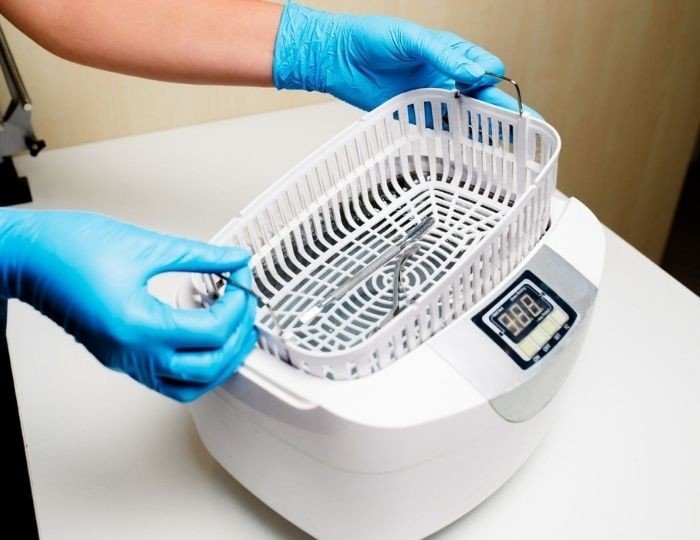 手洗いでは落としきれない微細な汚れを超音波の振動で取り除き、滅菌前の洗浄を徹底します。